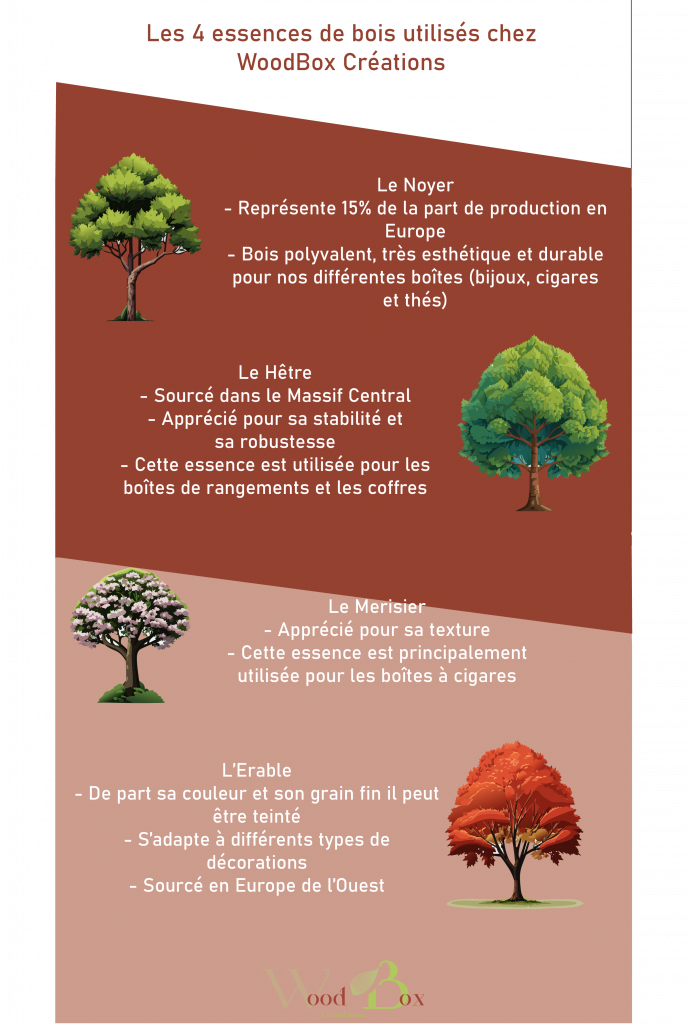 Découvrez la richesse de notre palette de matières premières les quatre essences de bois qui donnent vie à l’artisanat exceptionnel de WoodBox Créations. Cette datavisualisation vous plonge au cœur de nos sources d’inspiration naturelles, mettant en lumière la diversité et la beauté de chaque bois sélectionné avec soin. Explorez les caractéristiques uniques de chaque essence, des tons chaleureux du noyer à la résistance inébranlable du chêne, en passant par la douceur de l’érable. Cette visualisation captivante vous offre un aperçu de notre engagement envers la qualité et l’esthétique, ainsi que de notre profond respect pour la nature.